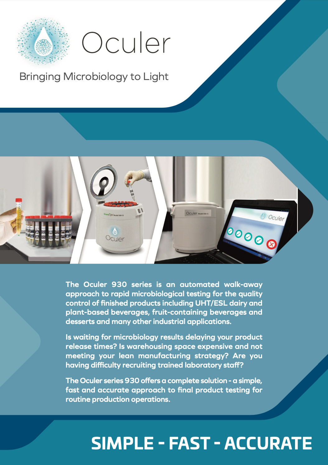 The Oculer 930 series is an automated walk-away approach to rapid microbiological testing for the quality control of finished products including UHT/ESL dairy and plant-based beverages, fruit-containing beverages and desserts and many other industrial applications.